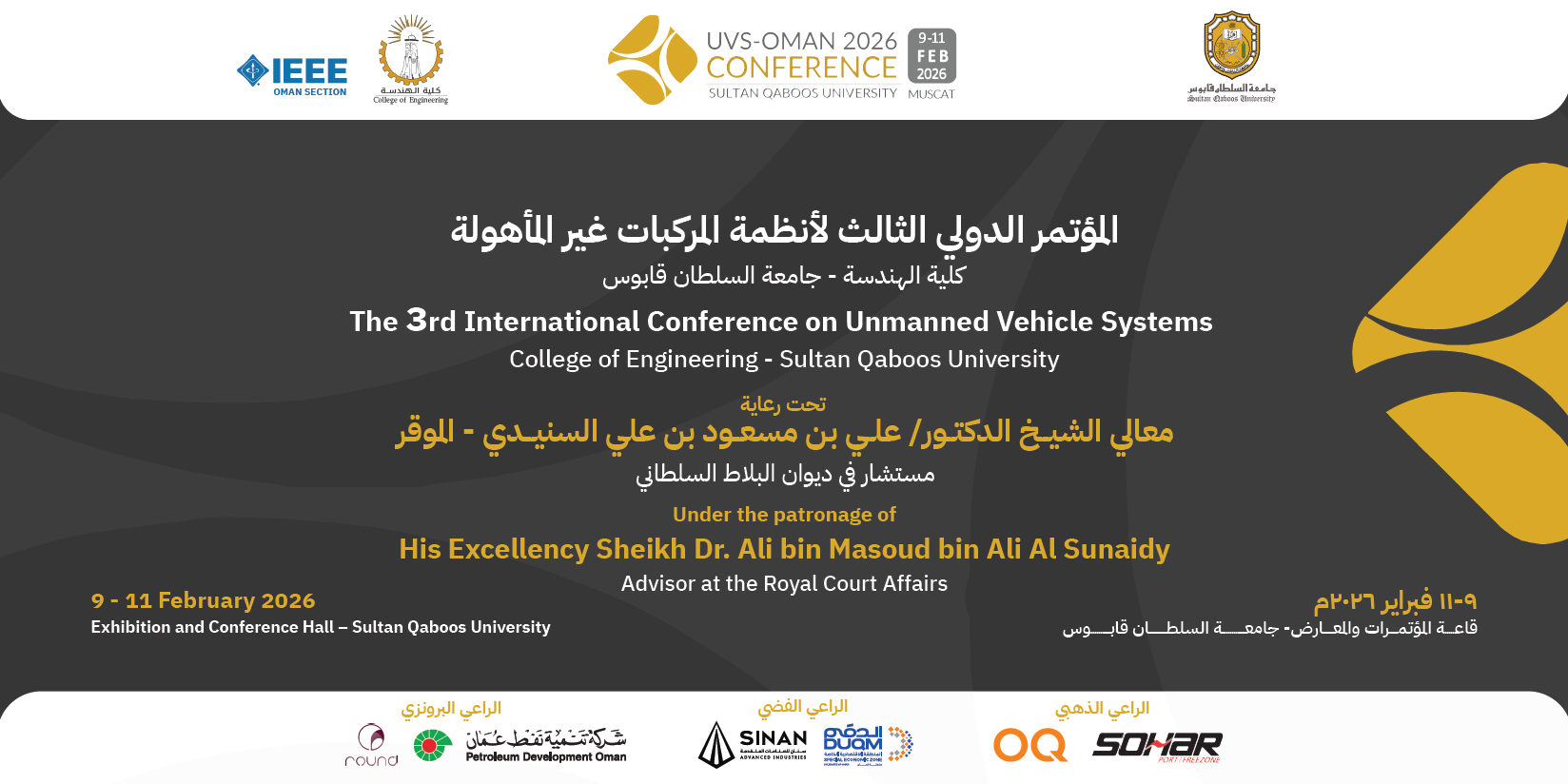 The 3rd International Conference on Unmanned Vehicle Systems (UVS-Oman 2026) is organized by the College of Engineering at Sultan Qaboos University (SQU). This three-day event aims to bring together leading academicians, researchers, engineers, industrials, and regulators to increase awareness, share views, and exchange ideas and field experiences on numerous aspects of Unmanned Vehicle Systems (UVS). This conference organized by SQU is expected to provide an opportunity to network researchers, practitioners, students, and hobbyists to enrich interdisciplinary UVS and related platforms and present the most recent innovations, trials, future trends, applications, concerns as well as challenges and solutions developed and applied in the various fields of applications. A number of workshops, students’ projects competition, and an exhibition on UVS will be scheduled during the event .